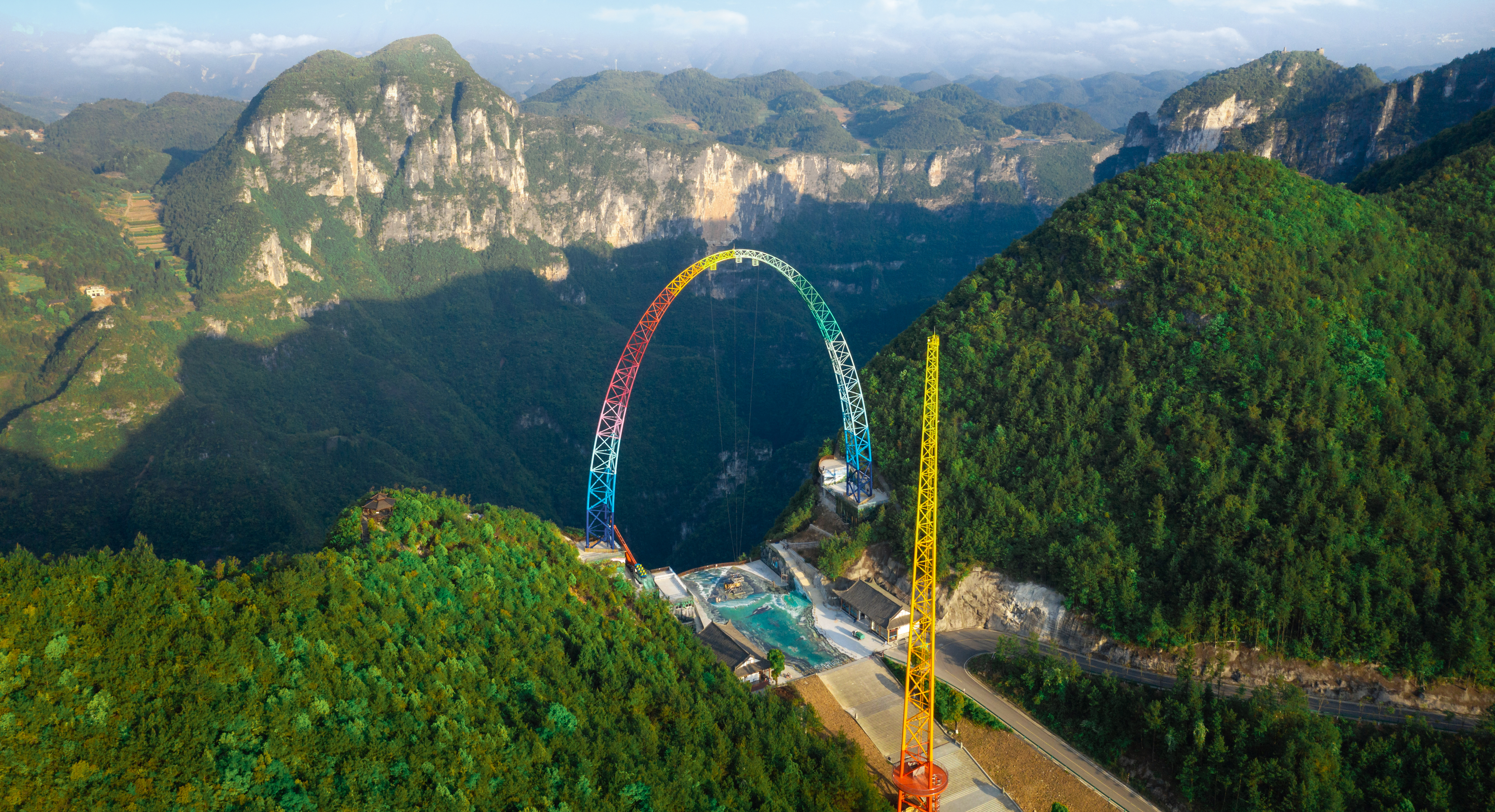 由中冶設備院自主研發、設計、制造、安裝的云端彩虹秋千,坐落于重慶龍缸5A景區700米的懸崖邊緣,主體由高100米、基礎跨距87.6米的彩虹涂裝拱形塔和高108米的提升發射塔等部分組成,該設備最大提升高度88m,最大運行速度可達130km/h,以“世界最高的框架秋千”稱號被載入吉尼斯世界紀錄。